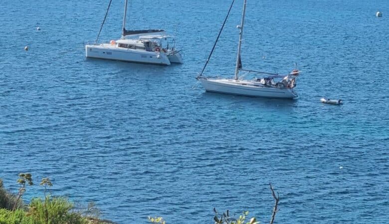 Einfacher gesagt als getan. Der Skipper der SY Moon erweist sich als völlig inkompetent und ist nicht in der Lage verantwortlich sein Boot zu führen. Mit viel Mühe gelingt es schließlich Jay und mir mit 2 Dinghys der kleinen Kat an die rostigen Tonnen zu binden.